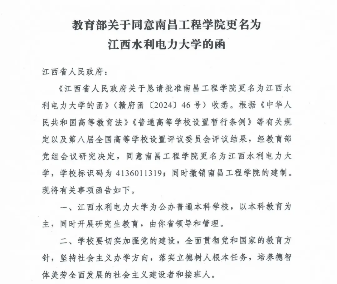 近日,教育部向江西省人民政府发送《教育部关于同意南昌工程学院更名为江西水利电力大学的函》,经教育部党组会议研究决定,同意南昌工程学院更名为江西水利电力大学。