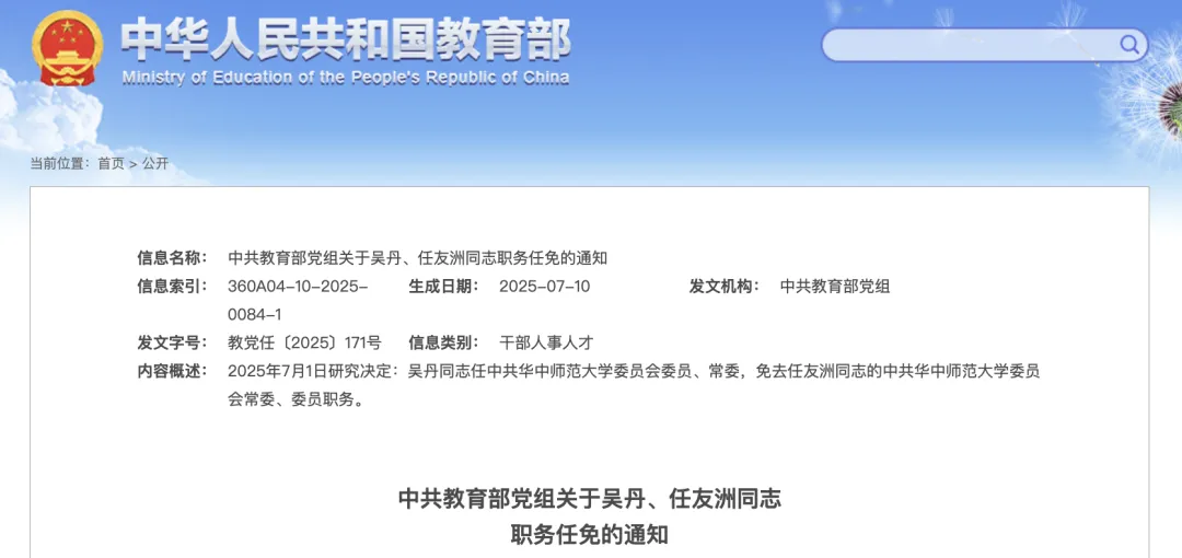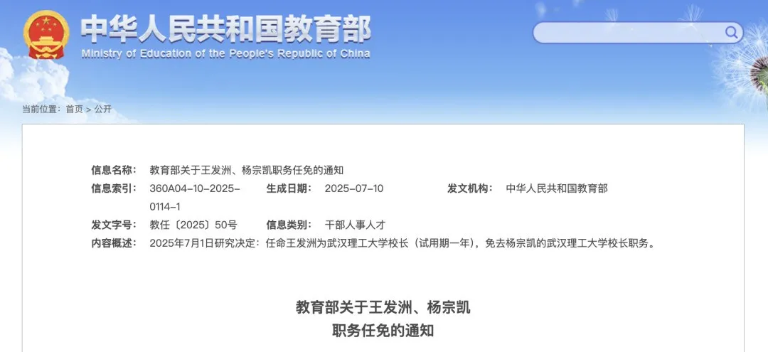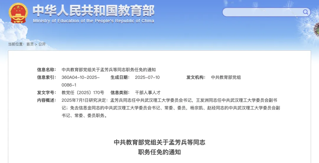 8月6日,教育部网站发布多条任免通知,其中涉及武汉理工大学、华中师范大学领导班子调整。