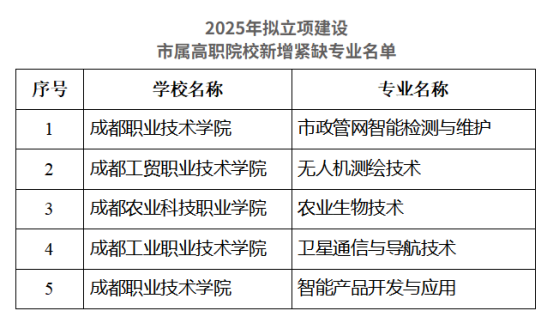 日前,成都市教育局发布《2025年市属高职院校新增紧缺专业建设项目名单公示》,拟遴选建设5个市属高职院校新增紧缺专业,包括:市政管网智能检测与维护、无人机测绘技术、农业生物技术、卫星通信与导航技术、智能产品开发与应用。