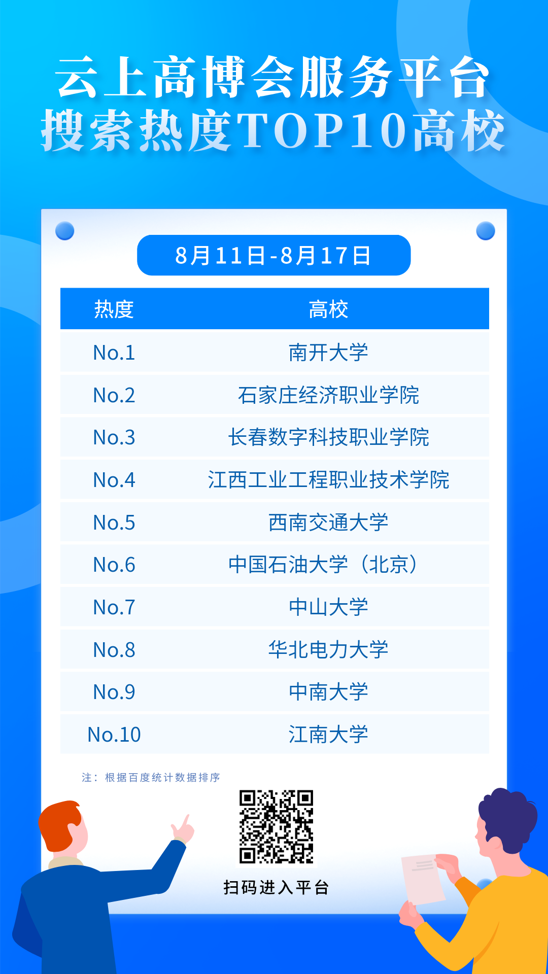 云上高博会服务平台8月11日-8月17日搜索热门榜单出炉。该榜单依托百度统计数据,综合网站搜索热度与访问量,分别筛选出企业、高校 top10名单。