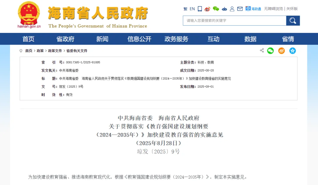 8月28日,中共海南省委、海南省人民政府发布关于贯彻落实《教育强国建设规划纲要(2024—2035年)》加快建设教育强省的实施意见(琼发〔2025〕9号)。意见提到,探索职业本科学校与应用型本科高校联合培养专业硕士;探索职业本科学校与应用型本科高校联合培养专业硕士。