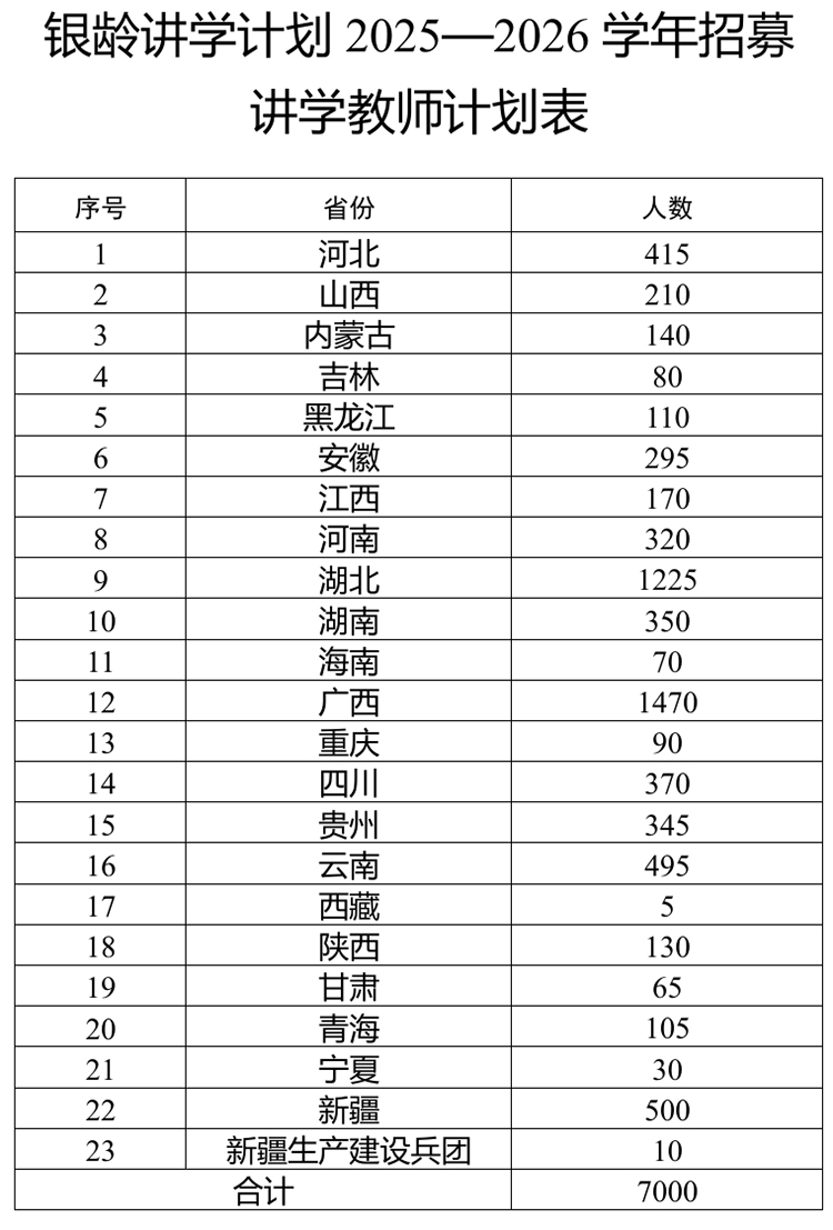 (二)招募人数。2025年义务教育阶段计划招募7000名讲学教师(见附件)。在此基础上,鼓励各省份和兵团结合实际,面向其他比较薄弱县乡地区和教育发展欠发达区域自主选拔优秀退休教师开展讲学,可酌情将普通高中纳入实施范围。
