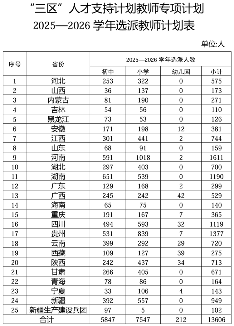 (二)选派数量。2025—2026学年全国计划选派13606名教师,其中初中计划选派5847名,小学计划选派7547名,幼儿园计划选派212名。各项目省要优化省内名额分配,加大跨县跨地市选派力度,充分调动省会城市、中心城市的优质资源,加强对所辖国家乡村振兴重点帮扶县支持。各项目省(区、市)和新疆生产建设兵团选派名额详见附件。
