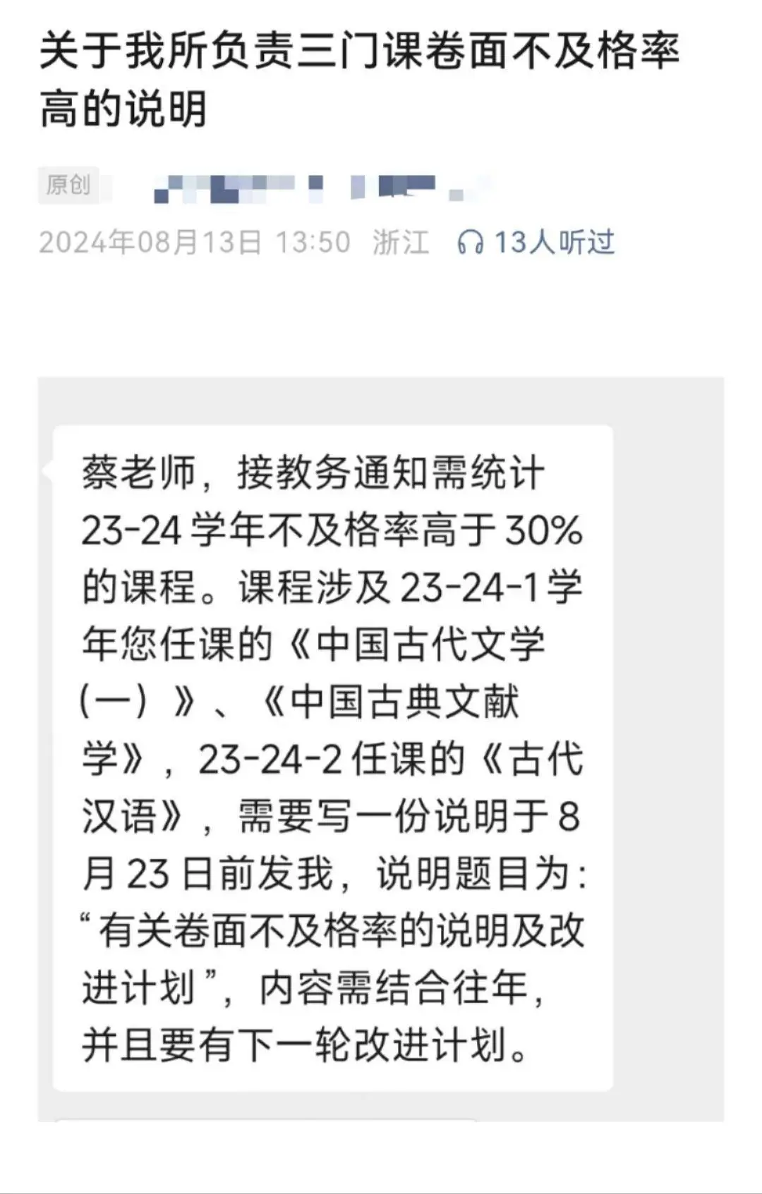 浙大城市学院人文学院教师蔡渊迪因所带的《古代汉语》等三门课程的卷面不合格率都在30%以上,被学校要求就此问题作解释说明并提供整改方案。