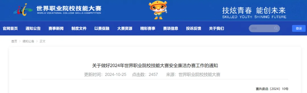 10月25日,世界职业院校技能大赛kok登录官网发布关于做好2024年世界职业院校技能大赛安全廉洁办赛工作的通知,提出将加强办赛安全管理、加强办赛参赛廉洁自律、营造和谐大赛氛围、严格落实惩处机制。