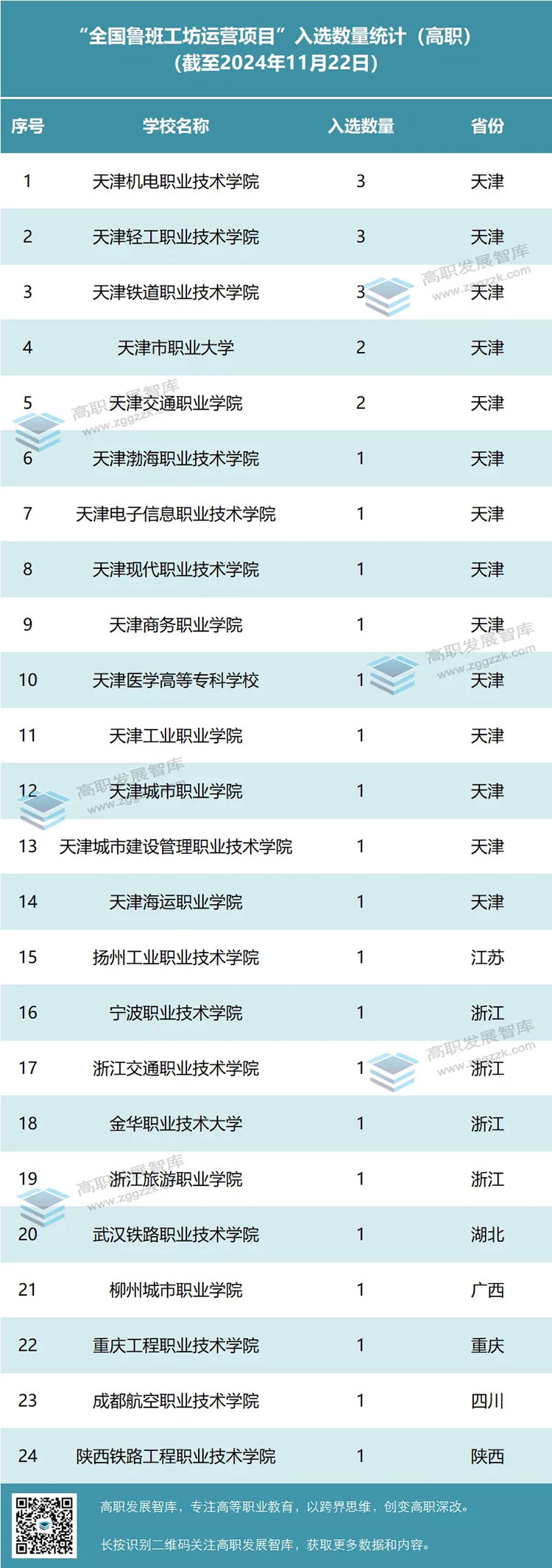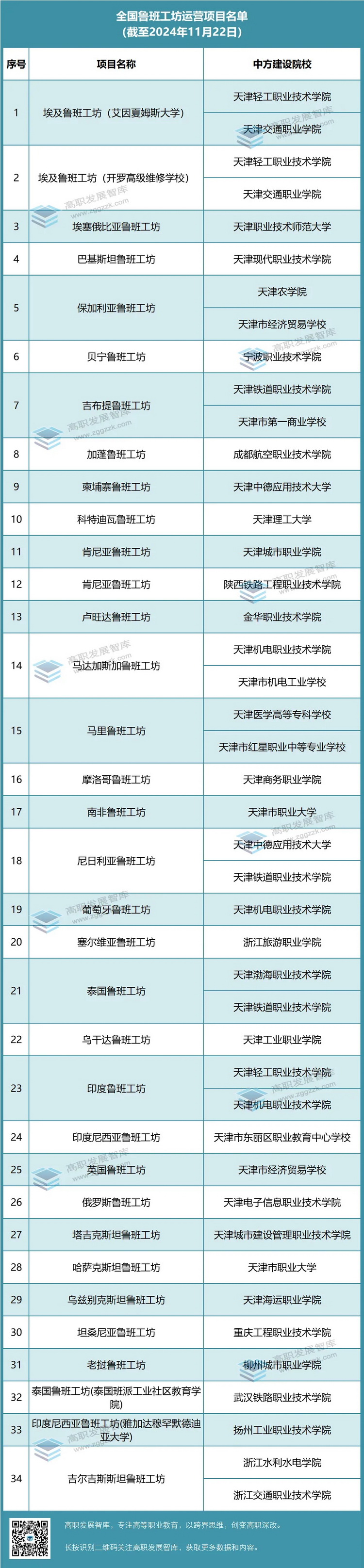 据高职发展智库统计,截至2024年11月22日,共有34个项目被中国教育国际交流协会认定为鲁班工坊运营项目。其中,全国共有24所高职院校的32个项目入选。