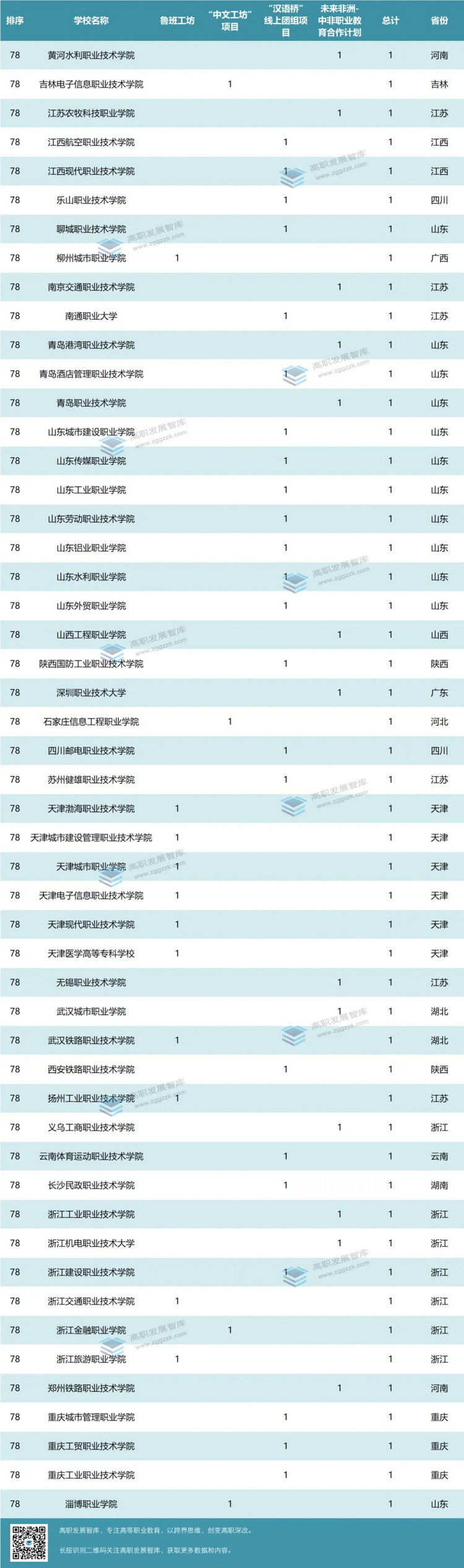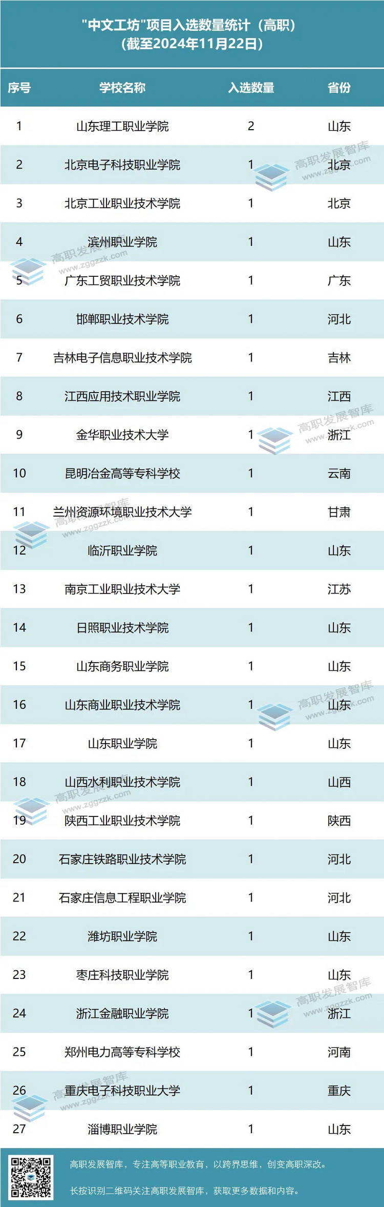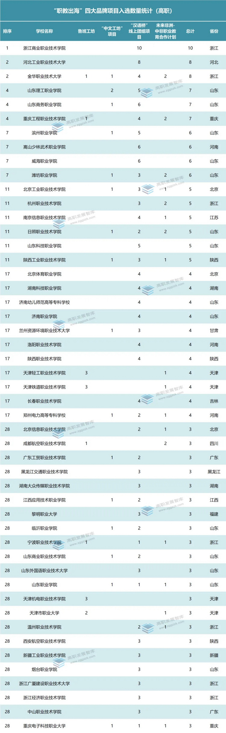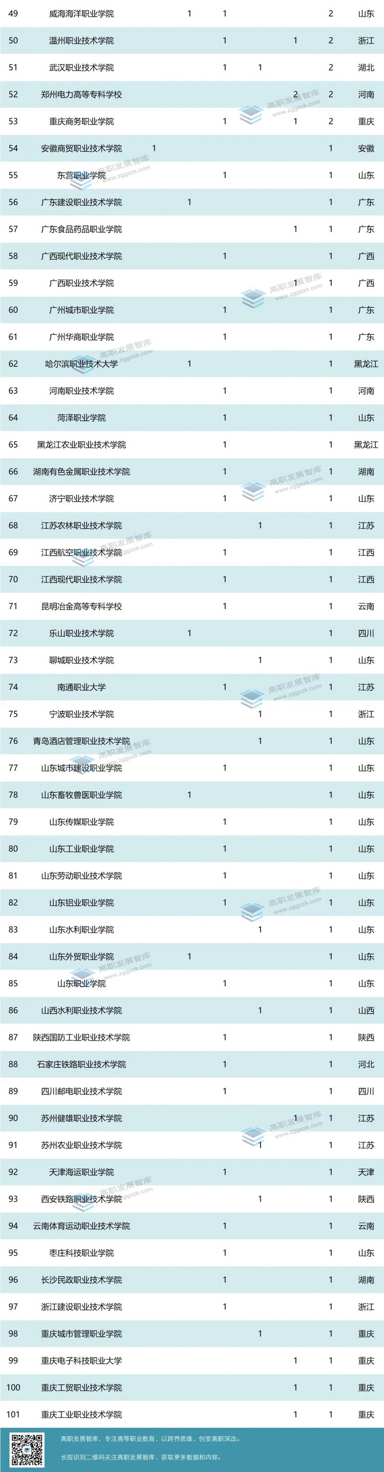 入选数量排在全国前十的高职院校还有:山东理工职业学院、山东商务职业学院、重庆工程职业技术学院、滨州职业学院、嵩山少林武术职业学院、威海职业学院、潍坊职业学院。