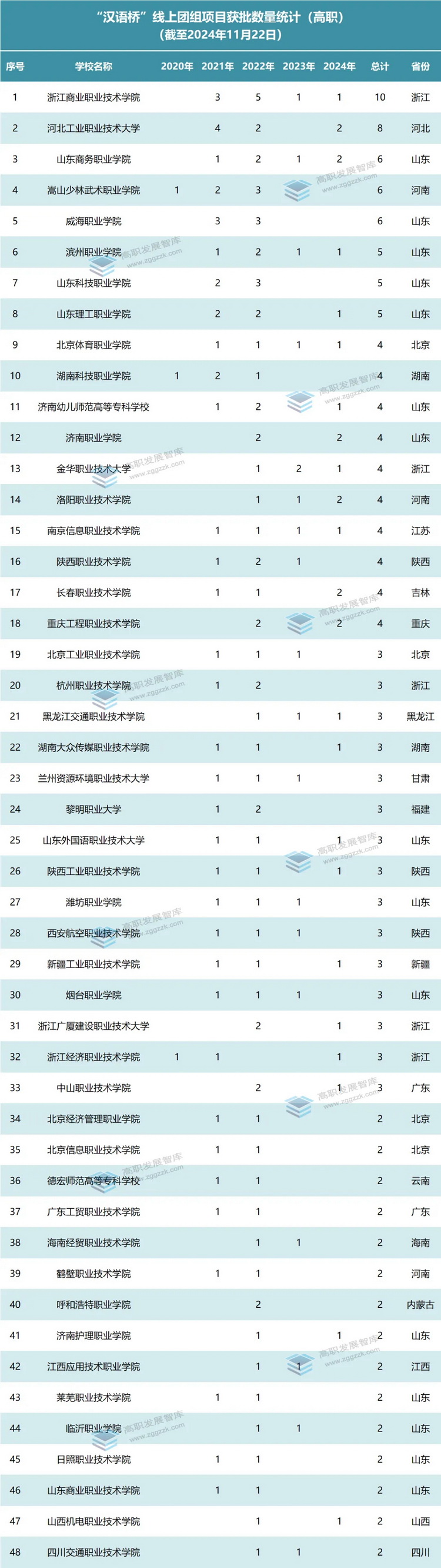 近日,高职发展智库对汉语桥团组在线体验平台高职院校承办的项目进行了统计。截至2024年11月22日,全国共有101所高职院校获批“汉语桥”线上团组项目224项。