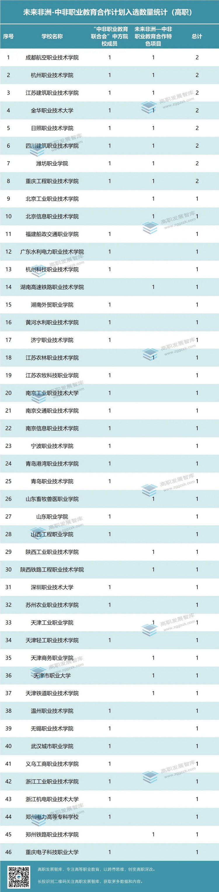 2024年8月,中国教育国际交流协会正式公布了“中非职业教育联合会”首批中方院校成员扩容名单,共有20所高职院校入围。截至2024年11月22日,全国共有34所高职院校入选“中非职业教育联合会”中方院校成员名单。