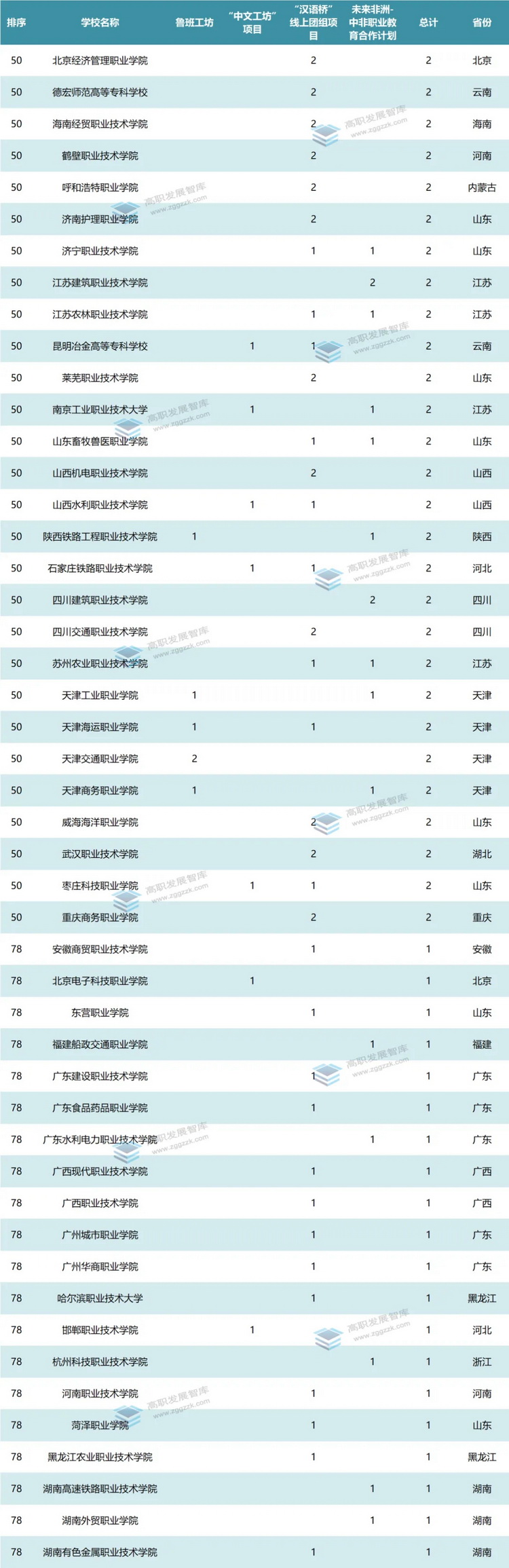 高职发展智库对“职教出海”四大品牌项目鲁班工坊、“中文工坊”项目、“汉语桥”线上团组项目、未来非洲-中非职业教育合作计划进行了汇总统计,全国共有148所高职院校入选。