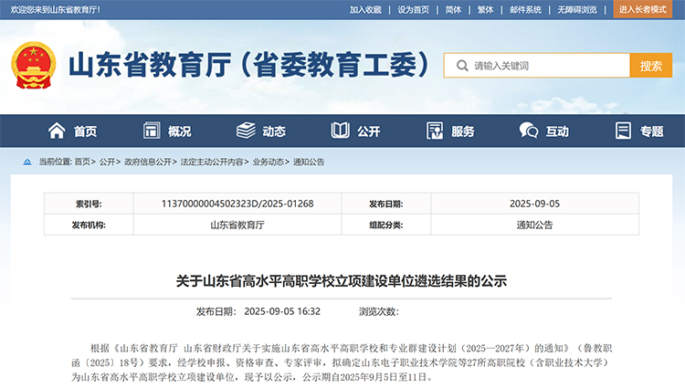 9月5日,山东省教育厅发布《关于山东省高水平高职学校立项建设单位遴选结果的公示》。