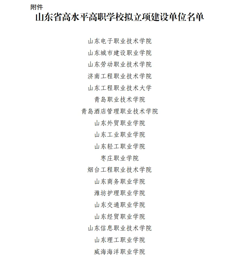 根据相关要求,经学校申报、资格审查、专家评审,拟确定山东电子职业技术学院等27所高职院校(含职业技术大学)为山东省高水平高职学校立项建设单位。具体名单如下: