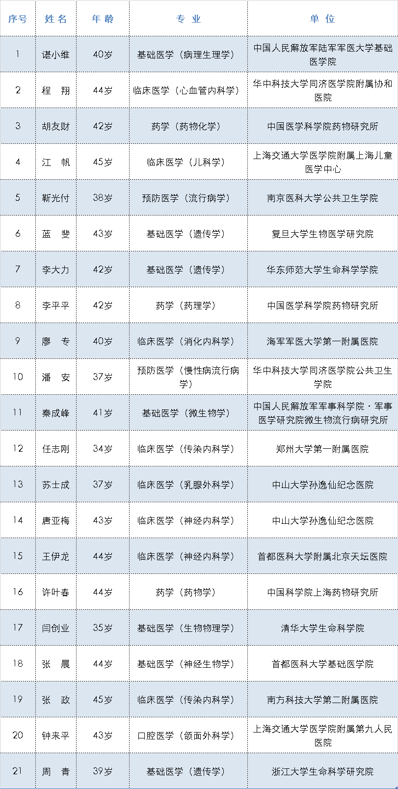 第七届树兰医学青年奖初评结果名单(共21人)