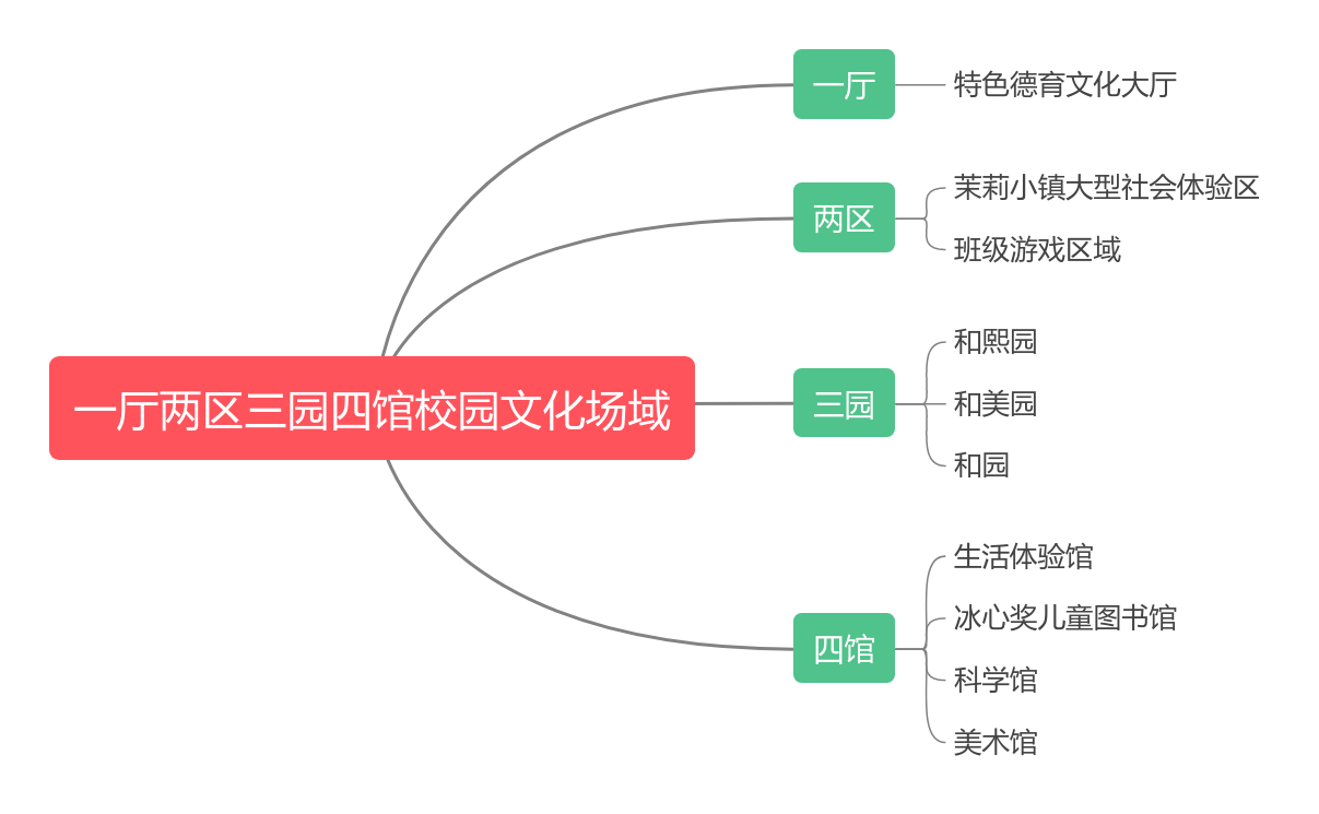 “两区”含两大功能区:保教大楼三楼“茉莉小镇”大型社会体验区,模拟横州茉莉小镇,划分为横州茉莉花茶厂、茉莉花茶店、茉莉茶庄、茉莉花手工创意坊、茉莉花养生吧五大区域;各班级游戏区,为幼儿提供合作交往、共同探究的空间。