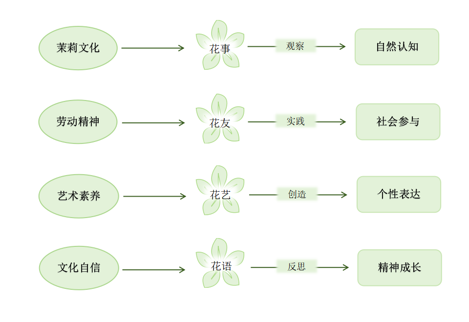 二是“花友”课程,培育劳动品质。引导幼儿认识茉莉产业链从业者,了解其对家乡的贡献,学习勤劳品格;组织“花友”对话等社会实践,助力幼儿理解茉莉产业链价值,培养其社会责任感与感恩心。