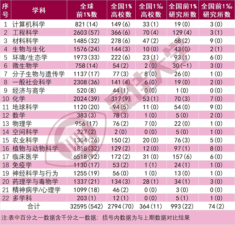 全球进入前百分之一的学科32595个,比上期增加542个,中国大陆高校进入前百分之一的学科2794个(新增70个),其中千分之一的学科364个(新增11个),表现强劲。机构进入前百分之一的学科993个(新增22个),千分之一的学科74个(新增2个)。具体情况如下表所示: