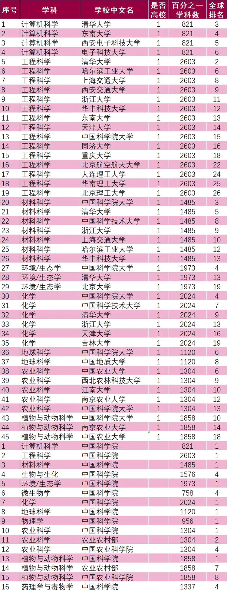 esi万分之一学科为全球顶尖水平行列学科的标志,目前我国大陆高校万分之学科一共45个,其中中国科学院大学7个,清华大学5个,浙江大学3个,东南大学、哈尔滨工业大学、华中科技大学、南京农业大学、上海交通大学、天津大学、中国科学技术大学、中国农业大学各2个,北京大学、北京航空航天大学、北京理工大学、大连理工大学、电子科技大学、华南理工大学、吉林大学、江南大学、同济大学、西安电子科技大学、西安交通大学、西北农林科技大学、中国地质大学、重庆大学各1个。