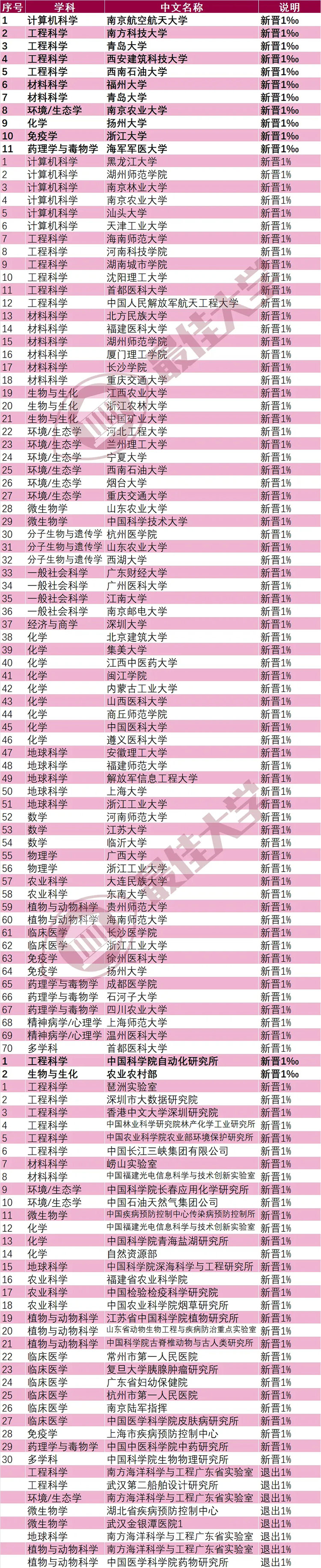 新晋千分之一的11个学科,包括南京航空航天大学的计算机科学,南方科技大学、青岛大学、西安建筑科技大学、西南石油大学的工程科学,福州大学、青岛大学的材料科学,南京农业大学的环境/生态学,扬州大学的化学,浙江大学的免疫学,海军军医大学的药理学与毒物学等。
