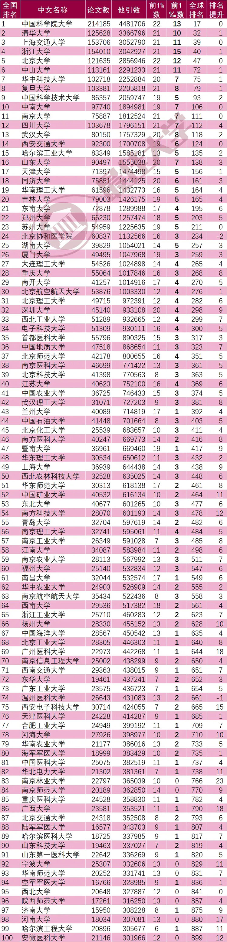 全国有学科进入全球前1%的所高校中(北京协和医学院计入高校,北京协和医院计入机构,分开计算),中国科学院大学全球排名17名居全国第一,清华大学(1)(括号内数字表示全球范围内提升名次,下同)全球排名32名居全国第二,上海交通大学全球排名39名居全国第三,浙江大学(1)全球排名40名居全国第四、北京大学全球排名47名居全国第五、中山大学(1)全球排名72名居全国第六、华中科技大学(1)全球排名75名居全国第七、复旦大学(1)全球排名79名居全国第八、中国科学技术大学(2)全球排名93名居全国第九、中南大学全球排名106名居全国第十。