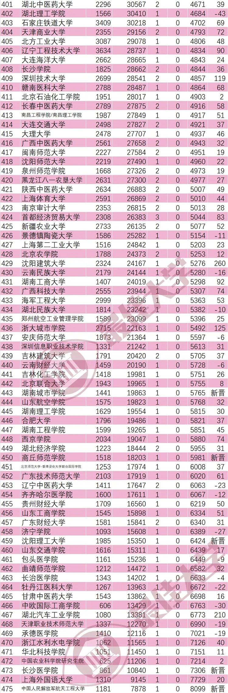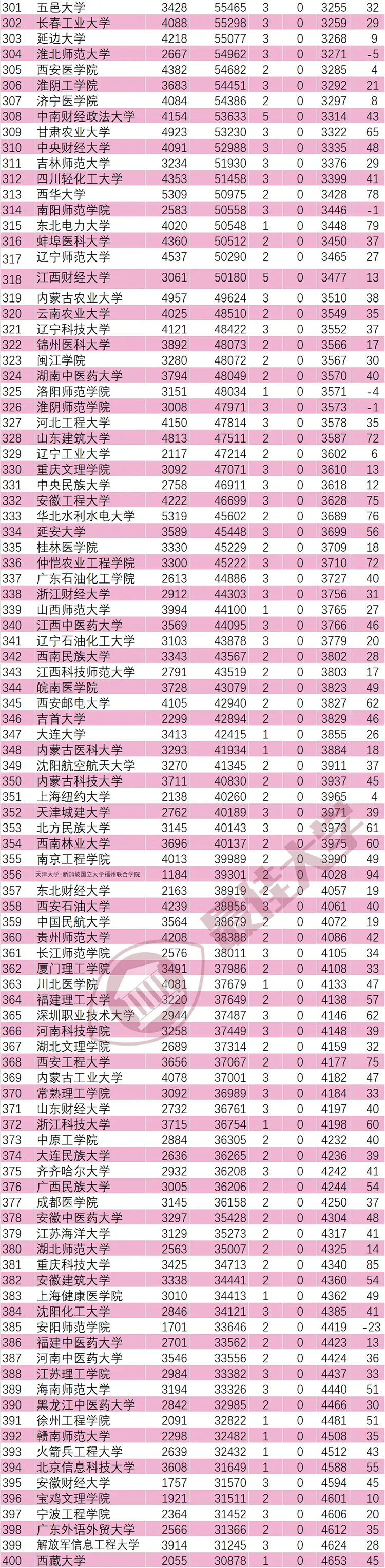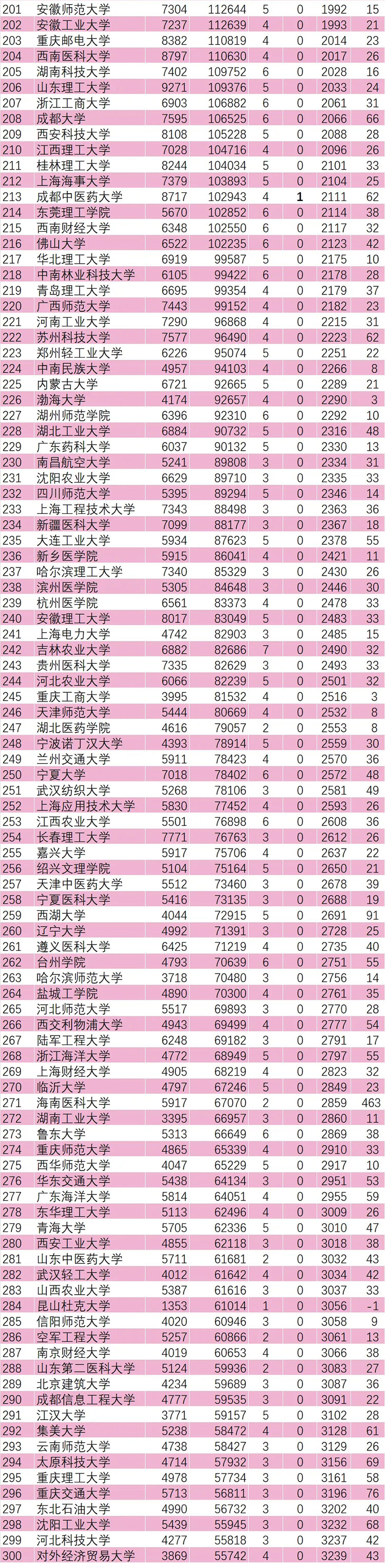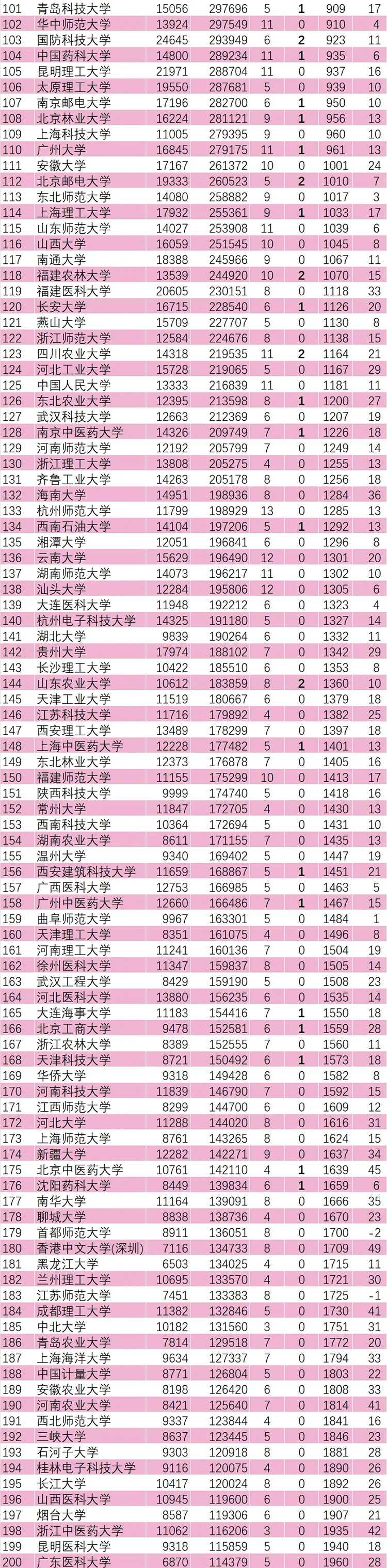 另外,海南医科大学(463)、沈阳建筑大学(260)、湖北汽车工业学院(210)、浙大城市学院(125)、深圳技术大学(119)、天津大学-新加坡国立大学福州联合学院(94)、湖南工商大学(92)、西湖大学(91)、辽宁工程技术大学(90)、重庆科技大学(85)、首都经济贸易大学(83)、东北电力大学(79)、西华大学(78)、重庆交通大学(76)、华北水利水电大学(76)、安徽工程大学(75)、西安工程大学(75)、广西科技大学(74)、西京学院(74)、山东建筑大学(72)、仲恺农业工程学院(72)、天津商业大学(72)进步均超过70名,表现强劲。