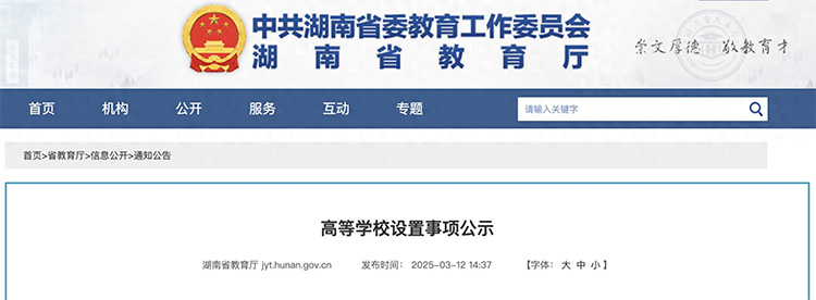 公示显示,根据《湖南省“十四五”高等学校设置规划》,经省第四届高等学校设置评议委员会专家组现场考察、集体评议,现将湖南理工学院更名为湖南理工大学、新设立岳阳科技职业学院、新设立邵阳通航职业技术学院予以公示。公示时间为2025年3月12日至2025年3月18日。