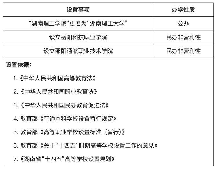 此外,还将新设立2所新高职,分别为岳阳科技职业学院、邵阳通航职业技术学院。