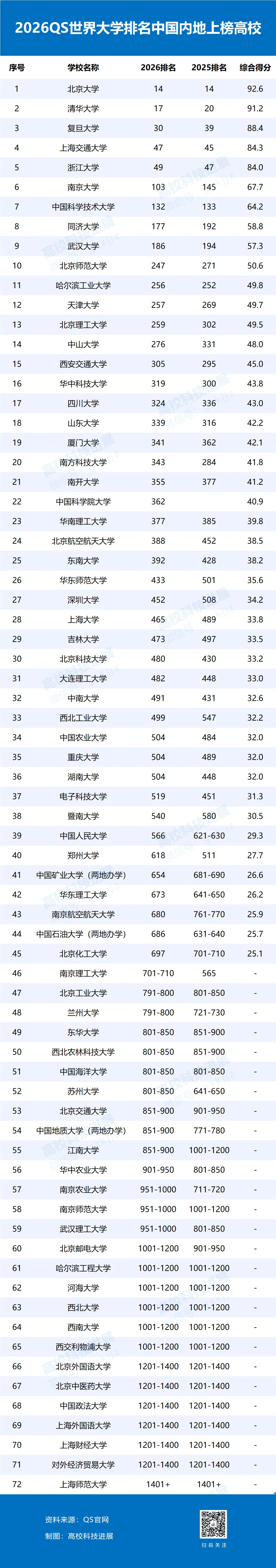 来源:qs世界大学排名官微、高校科技进展公从号。