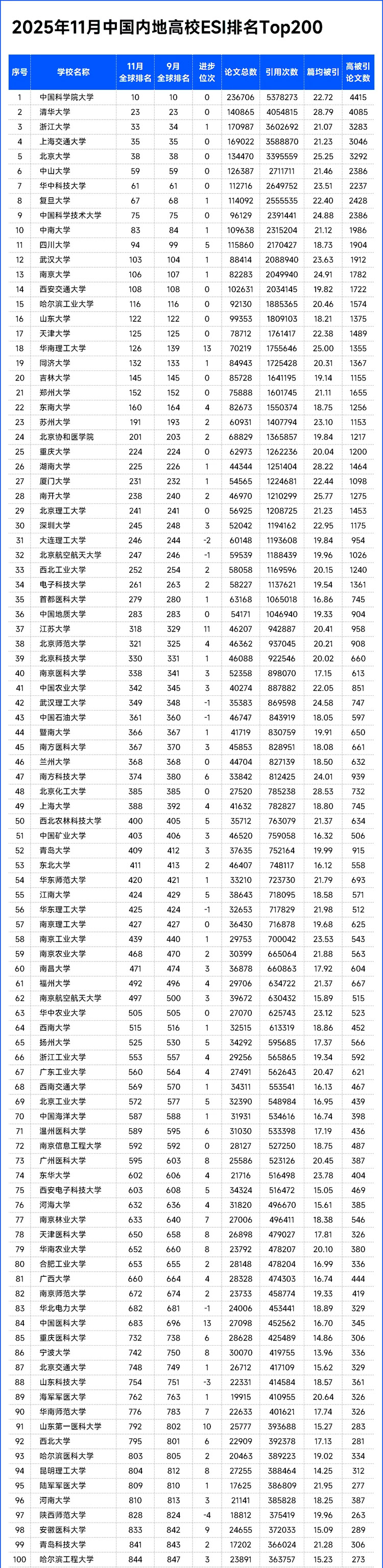 11月13日,科睿唯安(clarivate analytics)公布了2025年11月的esi最新数据。esi(基本科学指标数据库)是目前世界范围内普遍用以评价高校、学术机构、国家或地区国际学术水平及影响力的重要评价指标工具之一。本次数据覆盖时间范围为2015年1月到2025年8月。本文整理了中国内地高校200强的排名情况,一起来看看哪些高校又更进一步。