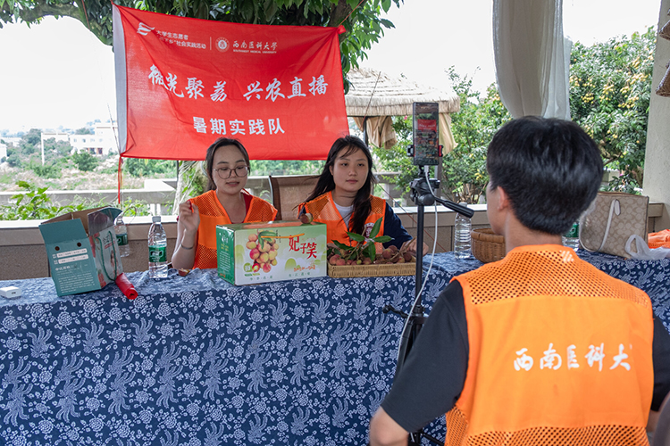 7月22日上午9点在泸州市合江县荔江镇柿子田村,西南医科大学基础医学院2023级二办“微光聚荔,兴农直播”暑假三下乡社会实践队开启第二天的社会实践活动。今日的实践活动为将新鲜“妃子笑”荔枝打包送往目的地,并进行第一场荔枝直播。