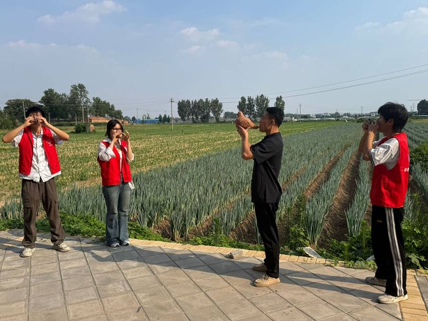 在制作完成后,成员和传承人杨玉冰一起在农田里吹响泥咕咕,这一声声泥咕咕的鸣响,是传承人与青春力量的对话。让古老技艺的温度,通过呼吸与乐声,传递给每一株庄稼、每一缕微风,诉说着传统工艺从未远去,正以青春创想的姿态,在生活土壤里持续生长。