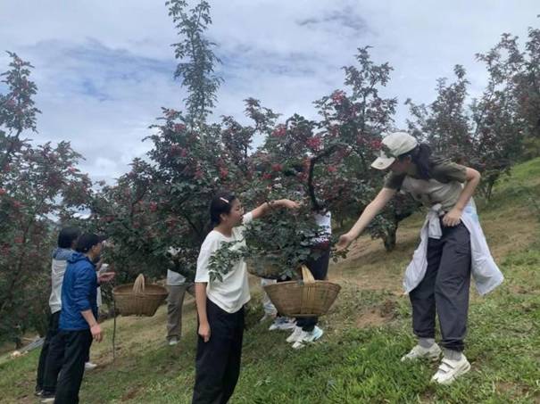 7月20日中午,实践队按计划在凤县站下车。素有“中国花椒之乡”美誉的凤县,其核心产业“大红袍”花椒(凤椒)种植面积达7.3万亩,年产值超6亿元,是当地乡村振兴的“绿色银行”。正值花椒采摘的旺季,无论是列车还是凤县及附近的车站都充斥着花椒的香气。队员们顶着烈日,在当地农户带领下深入双石铺镇的山间花椒田。“摘花椒要‘快、准、狠’!”农户现场示范:左手压枝避刺,右手稳准掐断果穗。起初,队员们畏手畏脚,不时被尖刺扎得生疼,或误将枝叶混入筐中。在乡亲们手把手的耐心指导下,大家逐渐掌握了技巧。汗水浸透了衣衫,指尖沾染了椒香,队员们真切体会到了“粒粒皆辛苦” 的含义,也深刻理解了特色产业对山区农民增收致富的关键作用。