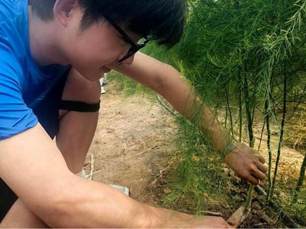 实践团成员在大棚体验采摘芦笋。安哲供图