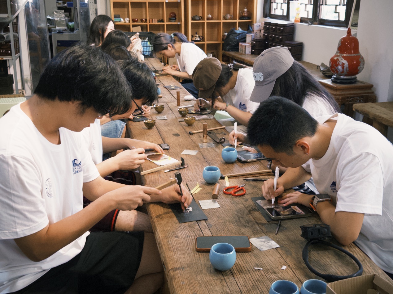 图为队员们在省级非遗-锡镶工艺基地体验錾刻锡镶纹样,并将“精致城市”元素融入锡镶设计,开发出系列文创产品。吴雅思 供图