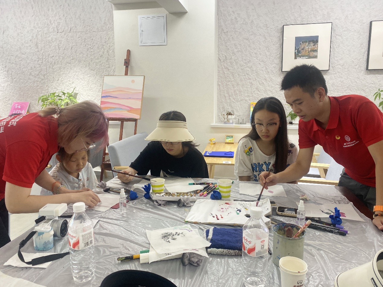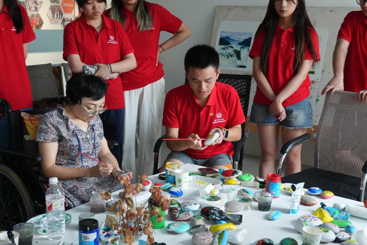 厦门大学暑期社会实践队还积极投身社会公益活动,参与基层社会治理。在长城爱心大本营,实践队成员通过与残疾人面对面交流、开展鹅卵石绘画技巧培训,将课堂所学专业知识转化为服务社会的实际行动,架起高校学子与特殊群体之间沟通与关爱的桥梁。大学生志愿者还现场授课,从文创产品市场规模、设计特点、消费者需求等层面,分享对文创产品创作及推广的见解。