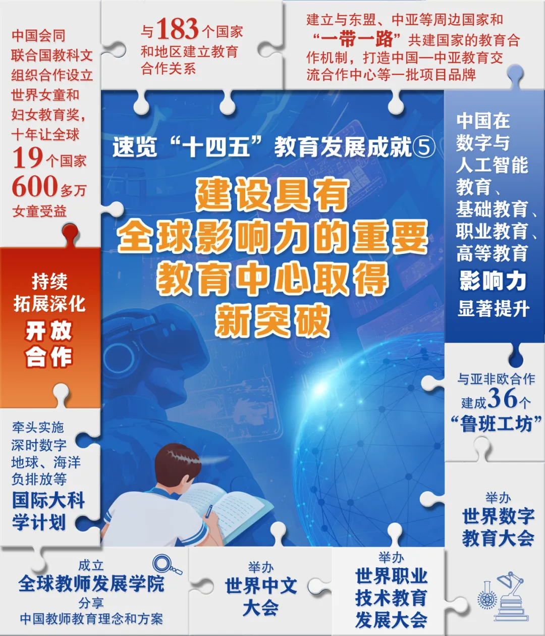在9月23日举行的国新办新闻发布会上,教育部部长怀进鹏表示,“十四五”时期,在党中央、国务院的坚强领导下,在全社会大力支持下,规划所确立的各项目标任务已全面高质量完成。跟随一组拼图,一起感受“十四五”教育发展成就。看向前程,锚定十年目标,一起“拼”出教育强国美好未来——
