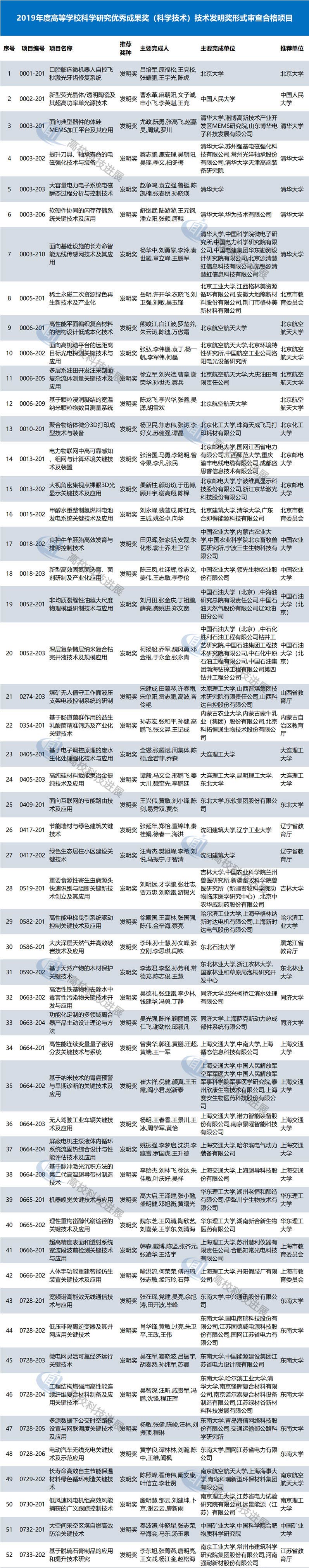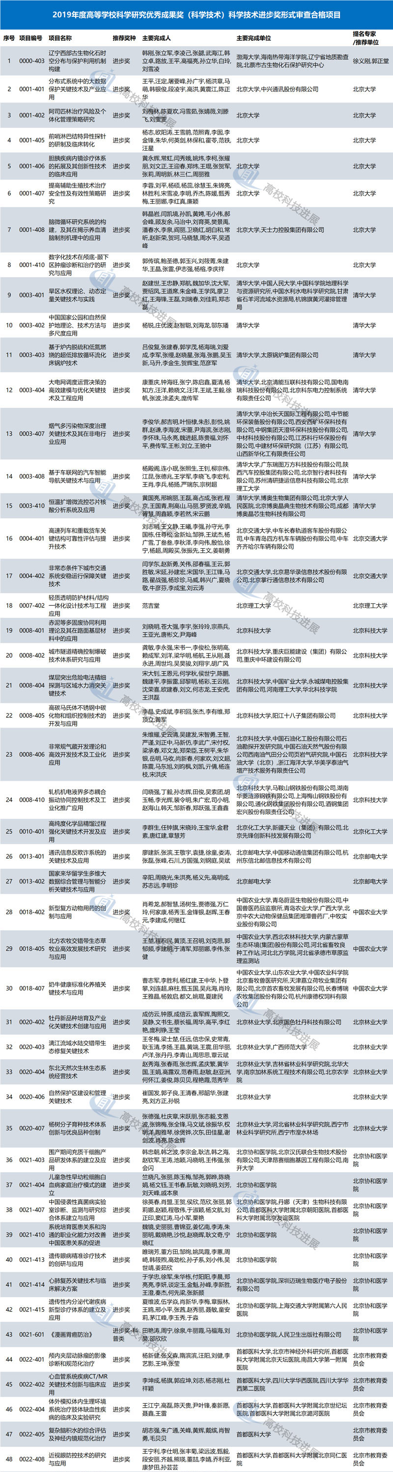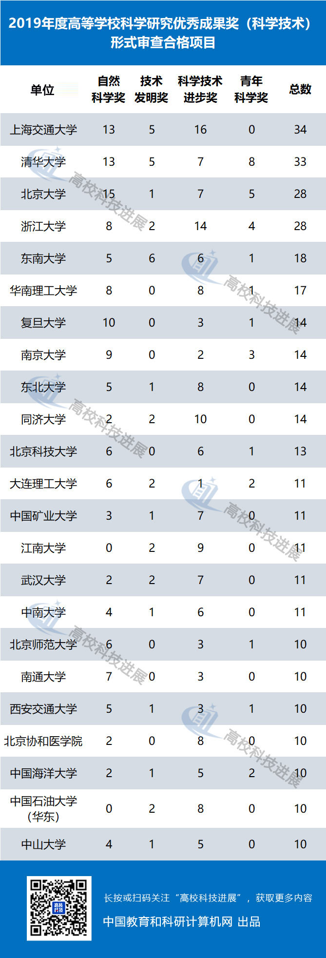 科学技术进步奖共有422项(通用项目406项,专用项目16项)形式审查合格。在通用项目的统计结果中,共有167所高校以第一完成单位牵头的项目通过审查。形式审查合格项目较多的高校分别是上海交通大学16项,浙江大学14项,同济大学10项,江南大学9项,北京协和医学院、东北大学和中国石油大学(华东)均为8项,北京大学、清华大学、武汉大学和中国矿业大学各有7项,北京科技大学、东南大学、中南大学、首都医科大学、江苏大学分别有6项,北京林业大学、中国矿业大学(北京)、中国医科大学、河海大学、中国海洋大学、华中科技大学、中山大学、华南理工大学、中国人民解放军海军军医大学以及五邑大学各有5项。