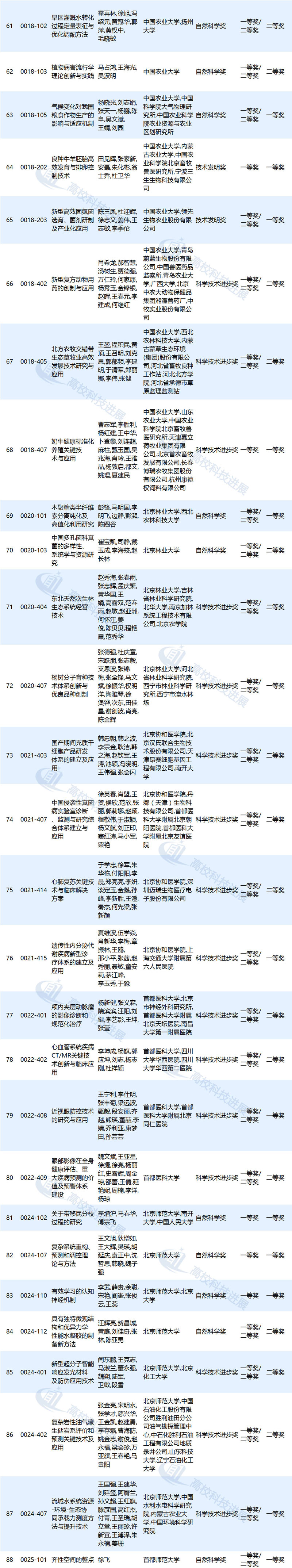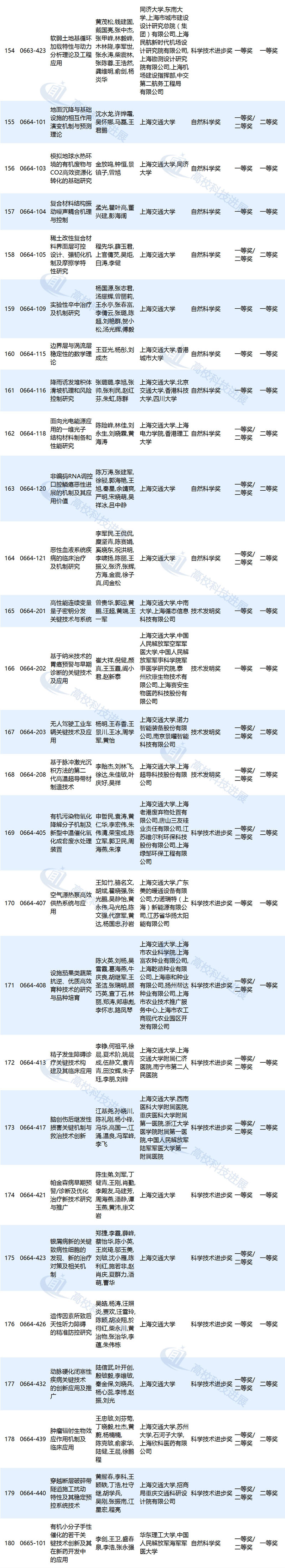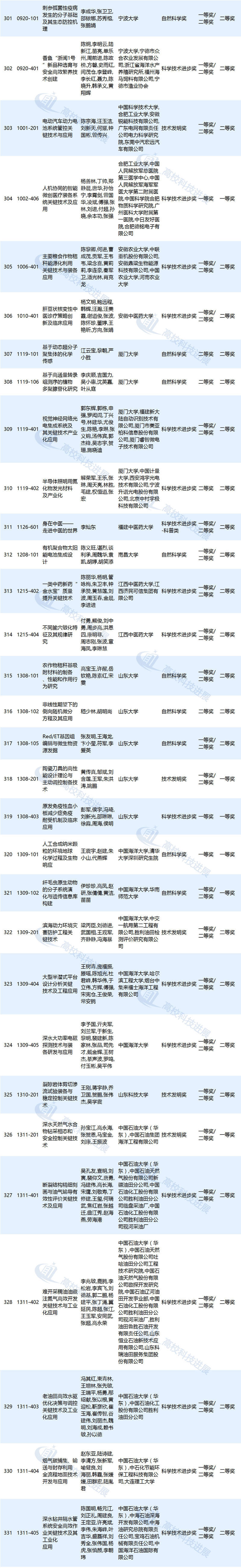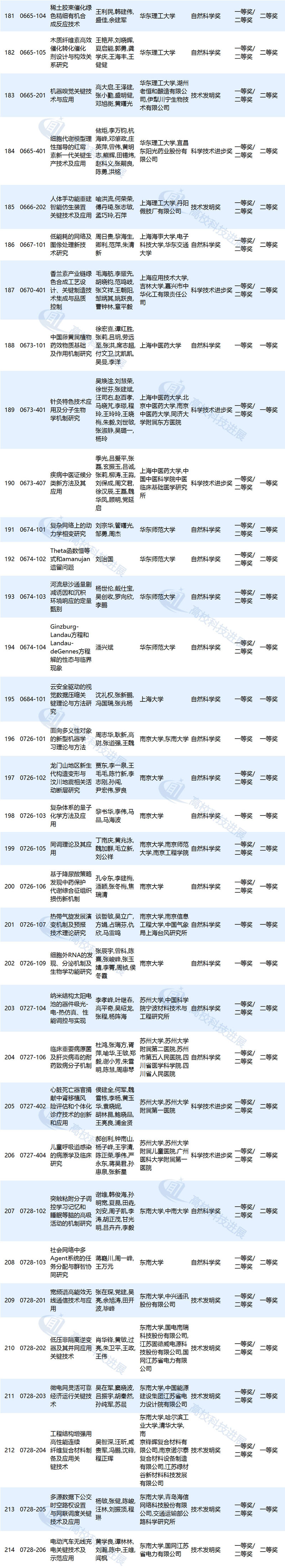 作为第一完成单位,上海交通大学获奖项目为25项,清华大学获奖项目为20项,北京大学、浙江大学获奖项目分别为17项,东南大学获奖项目为11项,东北大学获奖项目为9项,中国农业大学、同济大学、江南大学、中国石油大学(华东)等高校获奖项目分别为8项,大连理工大学、复旦大学、南京大学等高校获奖项目分别为7项,武汉大学、华南理工大学、四川大学等高校获奖项目分别为6项,北京航空航天大学、华东理工大学、山东大学等高校获奖项目分别为5项,北京科技大学、北京林业大学、北京协和医学院等高校获奖项目分别为4项(高校获奖情况详见文末附表)。