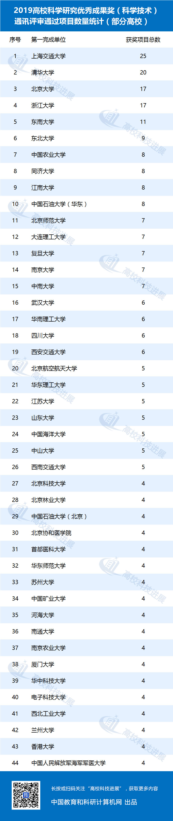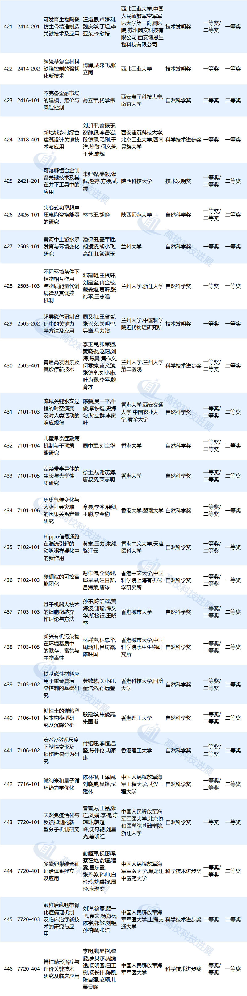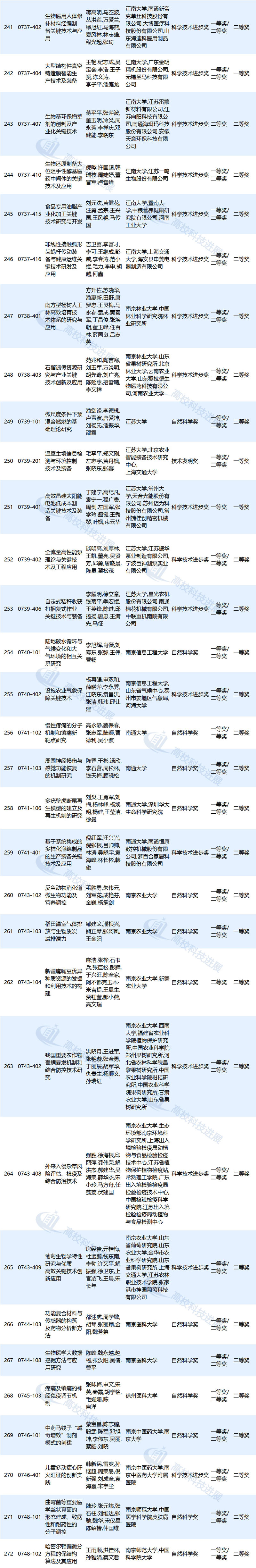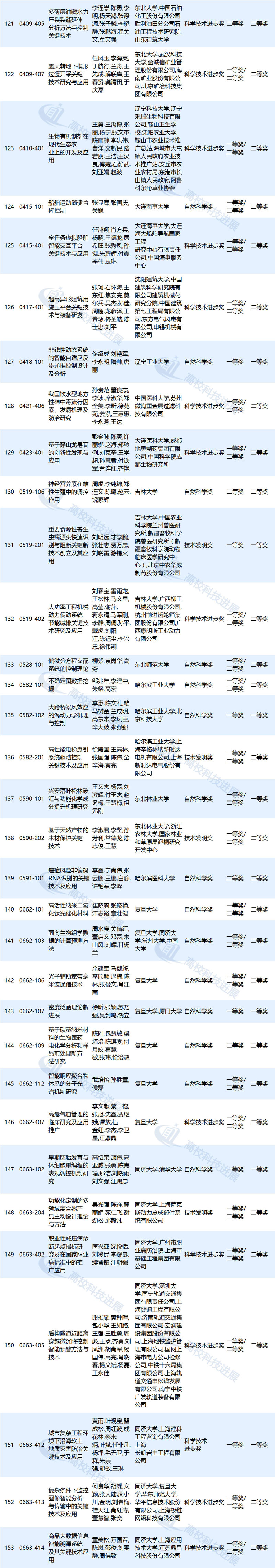 作为第一完成单位,上海交通大学获奖项目为25项,清华大学获奖项目为20项,北京大学、浙江大学获奖项目分别为17项,东南大学获奖项目为11项,东北大学获奖项目为9项,中国农业大学、同济大学、江南大学、中国石油大学(华东)等高校获奖项目分别为8项,大连理工大学、复旦大学、南京大学等高校获奖项目分别为7项,武汉大学、华南理工大学、四川大学等高校获奖项目分别为6项,北京航空航天大学、华东理工大学、山东大学等高校获奖项目分别为5项,北京科技大学、北京林业大学、北京协和医学院等高校获奖项目分别为4项(高校获奖情况详见文末附表)。