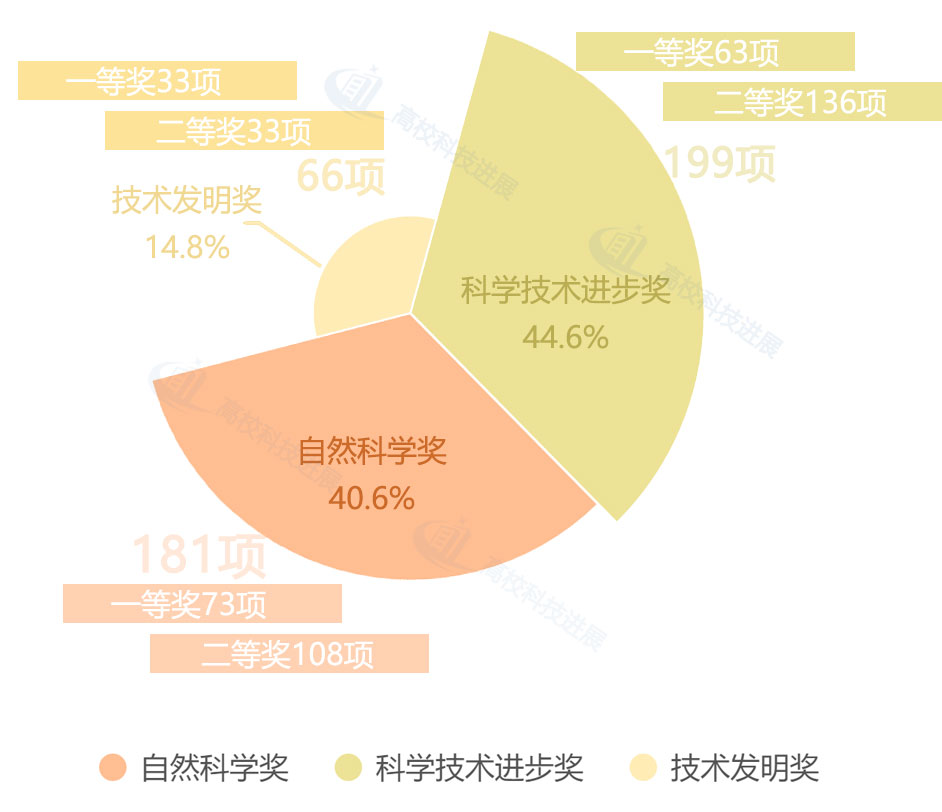 从授奖等级情况来看,在通过评审的项目中,高校获评一等奖和二等奖的项目数量分别为169项、277项。其中,自然科学奖获评一等奖和二等奖的项目分别为73项、108项,科学技术进步奖获评一等奖和二等奖的项目分别为63项、136项,技术发明奖获评一等奖、二等奖的项目数均为33项,自然科学奖获评一等奖的项目数量高于科学技术进步奖和技术发明奖。
