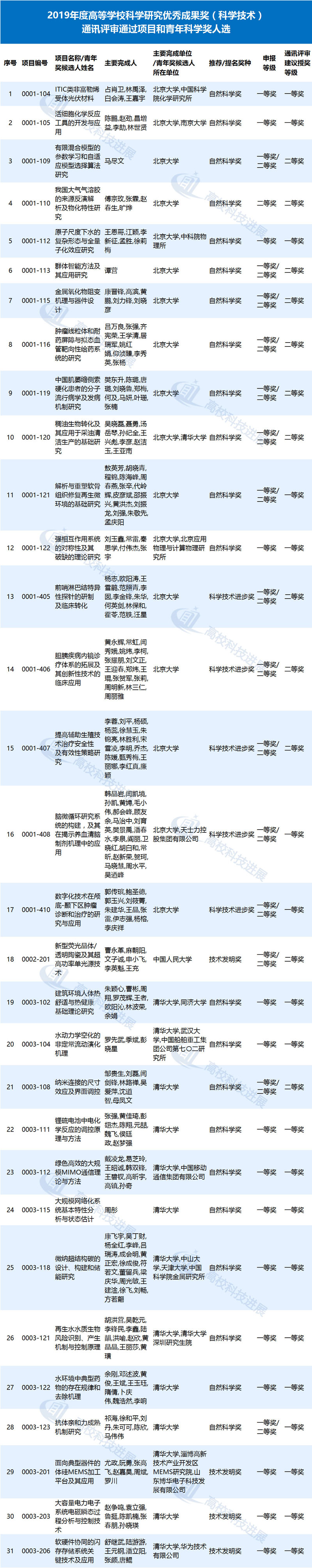 附:2019年度高等学校科学研究优秀成果奖(科学技术)通讯评审通过项目和青年科学奖人选