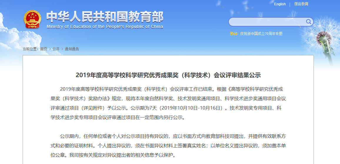 10月10日,教育部科技司正式对外公示2019年度高等学校科学研究优秀成果奖(科学技术)(以下简称“优秀成果奖”)会议评审结果。本次评审出的自然科学奖121个、技术发明奖通用项目45个、科学技术进步奖通用项目129个,共计295个奖项。