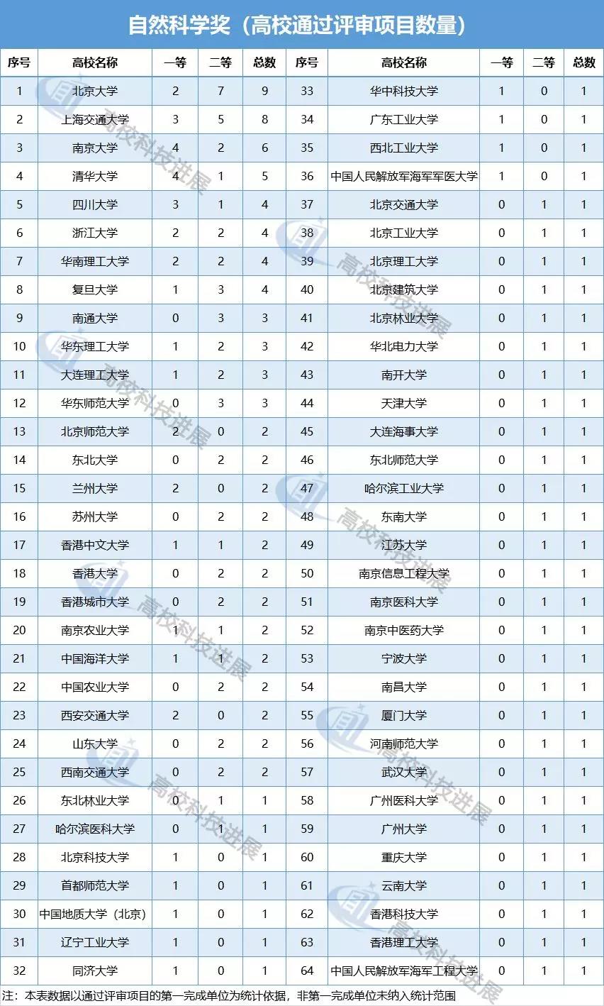 从自然科学奖的会议评审结果来看,共有64所高校推荐项目通过评审。