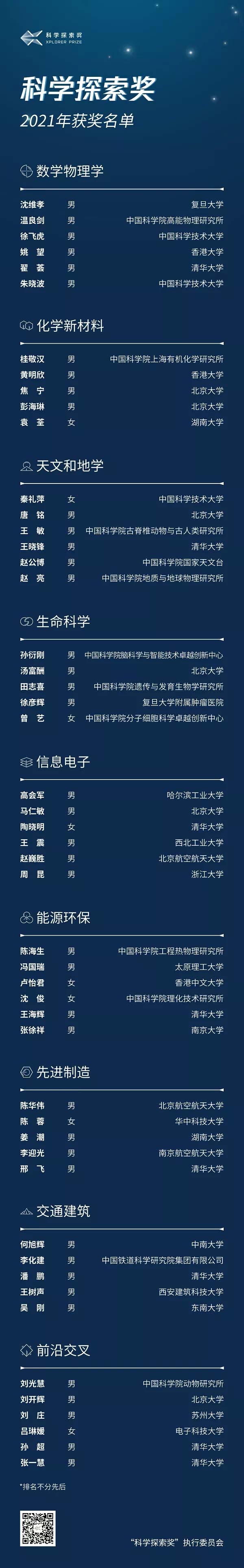 据介绍,“科学探索奖”是由腾讯基金会出资支持、科学家主导的公益性奖项,是目前国内金额最高的青年科技人才资助计划之一。该奖项聚焦数学物理学、生命科学、天文和地学、化学新材料、信息电子、能源环保、先进制造、交通建筑、前沿交叉等9个领域,支持在中国内地及港澳地区全职工作、45周岁及以下的青年科技工作者。