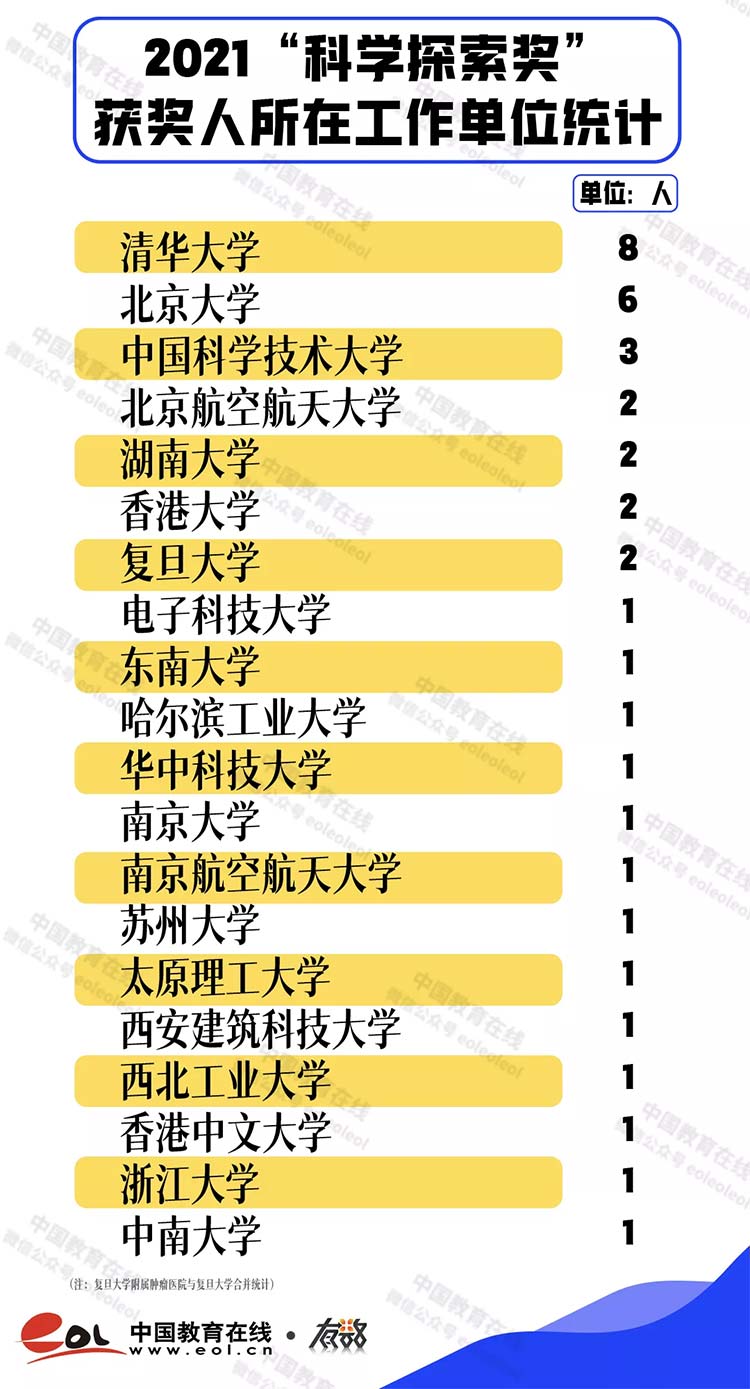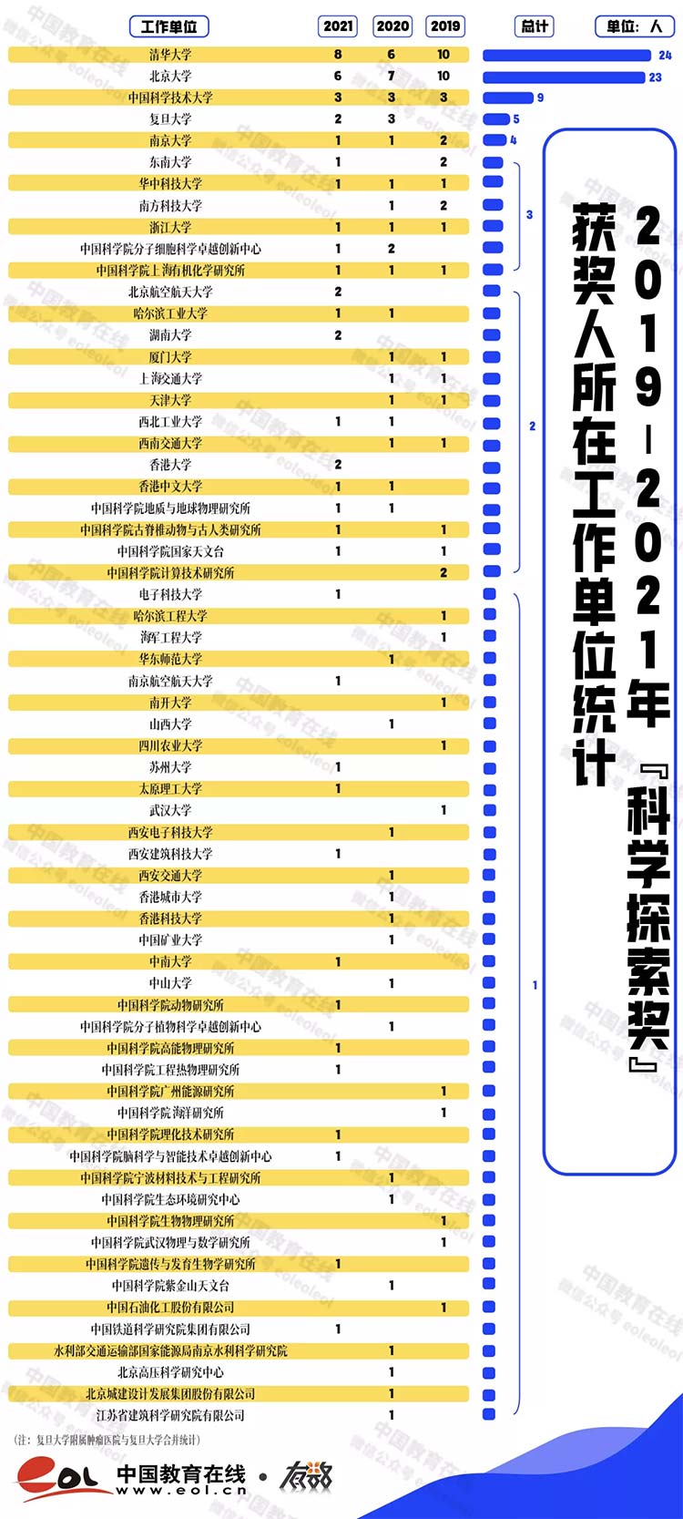 从三年的获奖名单来看,高校共有116人获奖,清华大学、北京大学的获奖人数最多,分别有24位、23位科学家获奖,其次,中国科学技术大学有9位科学家获此殊荣。