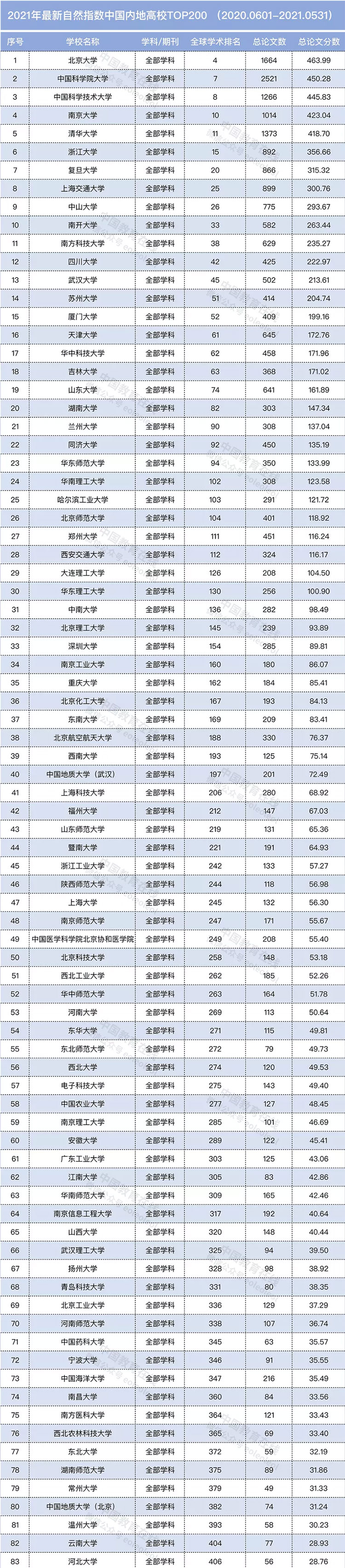 自然指数(nature index)于2014年11月首次发布,是依托于全球顶级期刊(2014年11月开始选定68种,2018年6月改为82种),统计各高校、科研院所(国家)在国际上最具影响力的研究型学术期刊上发表论文数量的数据库。运用这个数据库,可以根据各机构的论文发表数量及类别来进行排名和期刊索引。目前,自然指数已发展成为国际公认的能够衡量机构、国家和地区在自然科学领域的高质量研究产出与合作情况的重要指标,在全球范围内有较大影响力。