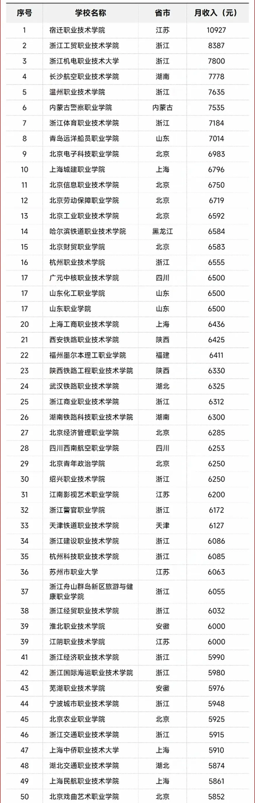 毕业生月收入在7000元以上的高校还有长沙航空职业技术学院、温州职业技术学院、内蒙古警察职业学院、浙江体育职业技术学院、青岛远洋船员职业学院。