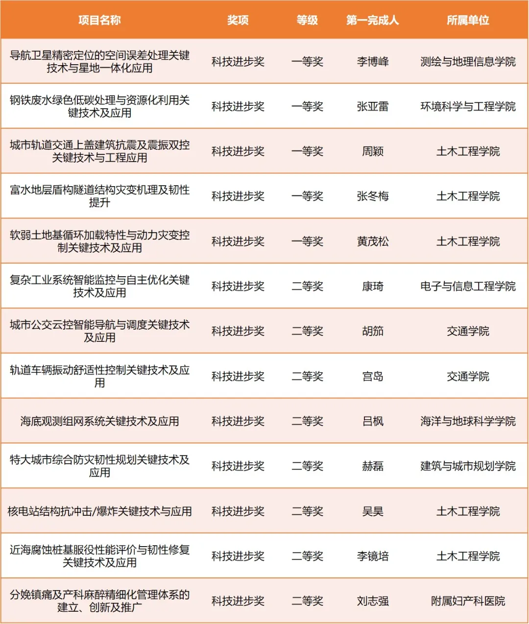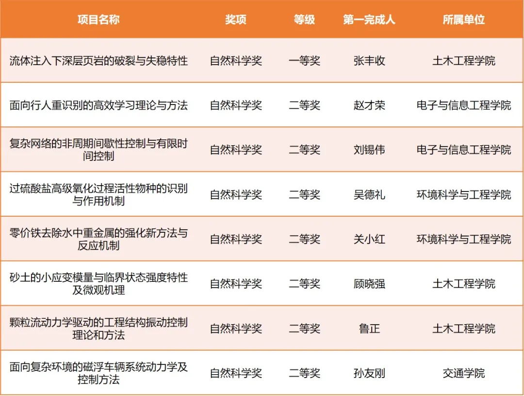 获科技进步奖13项,其中一等奖5项,分别是测绘与地理信息学院李博峰主持完成的“导航卫星精密定位的空间误差处理关键技术与星地一体化应用”、环境科学与工程学院张亚雷主持完成的“钢铁废水绿色低碳处理与资源化利用关键技术及应用”、土木工程学院周颖主持完成的“城市轨道交通上盖建筑抗震及震振双控关键技术与工程应用”、土木工程学院张冬梅主持完成的“富水地层盾构隧道结构灾变机理及韧性提升”、土木工程学院黄茂松主持完成的“软弱土地基循环加载特性与动力灾变控制关键技术及应用”。