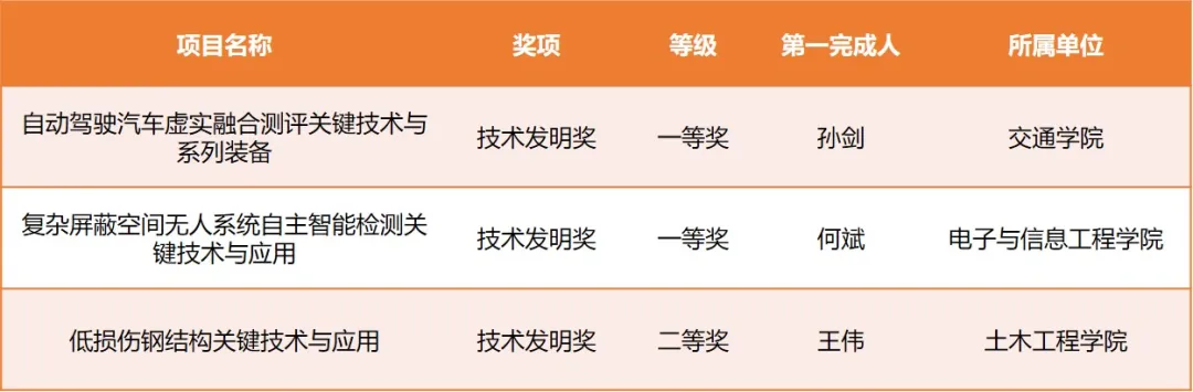 获技术发明奖3项,其中一等奖2项,分别是交通学院孙剑主持完成的“自动驾驶汽车虚实融合测评关键技术与系列装备”、电子与信息工程学院何斌主持完成的“复杂屏蔽空间无人系统自主智能检测关键技术与应用”。