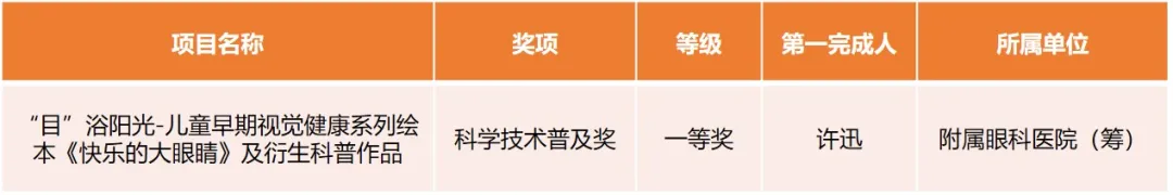 获科学技术普及奖一等奖1项,为附属眼科医院(筹)许迅主持完成的“‘目’浴阳光-儿童早期视觉健康系列绘本《快乐的大眼睛》及衍生科普作品”。