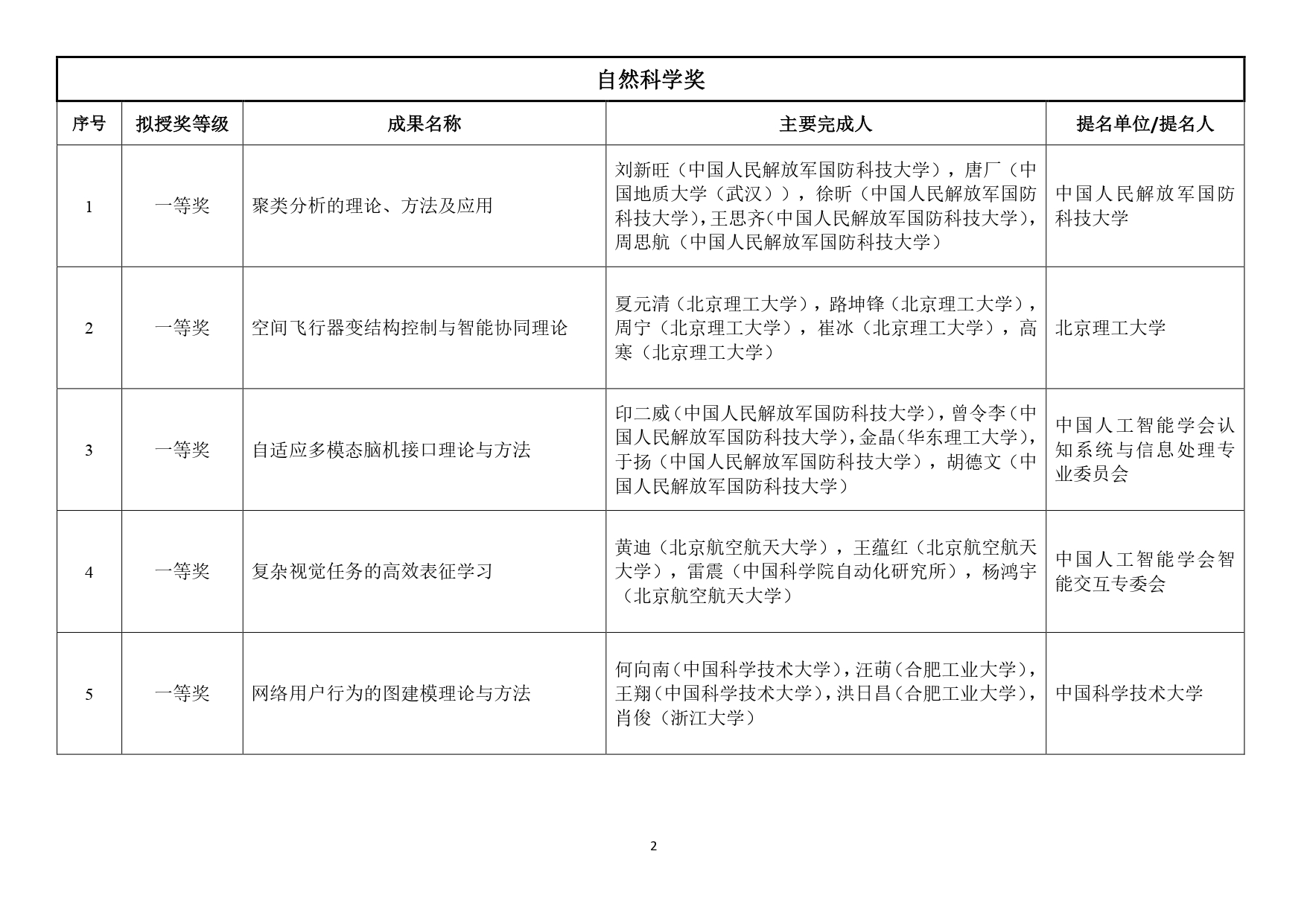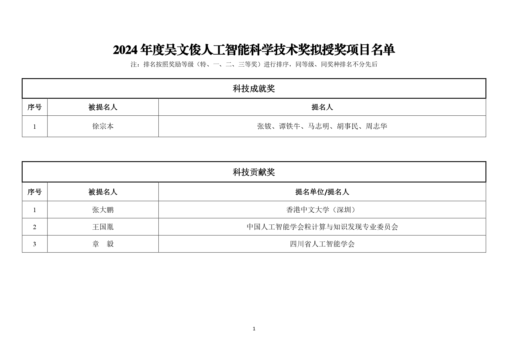 1月15日,中国人工智能学会公示2024年度吴文俊人工智能科学技术奖拟授奖项目名单。名单显示,徐宗本院士获科技成就奖提名,张大鹏、王国胤、章毅获科技贡献奖提名。此外,自然科学奖9项,技术发明奖8项,科技进步奖17项,青年科技奖15人。据统计,共有21所高校作为第一完成单位入选。